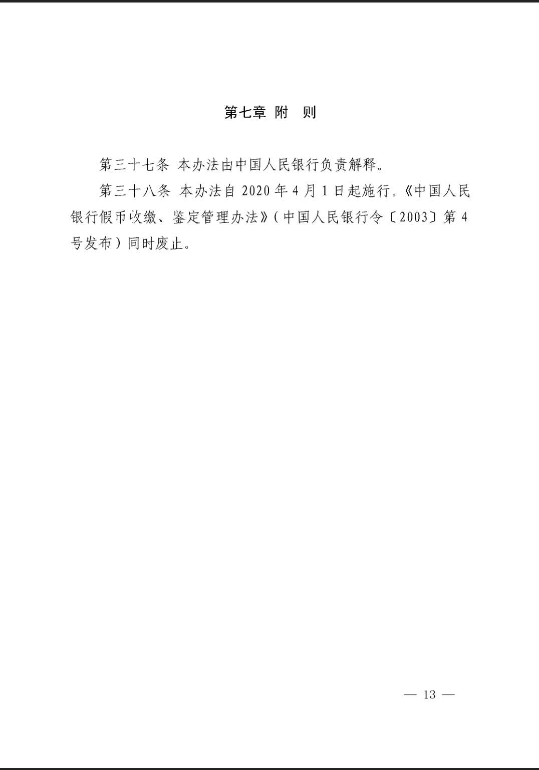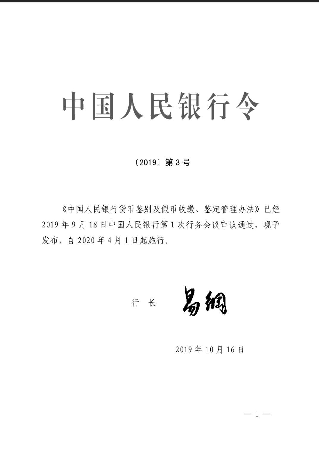 中国人民银行令【2019】第3号 关于中国人民银行货币鉴别及假币收缴、鉴定管理办法