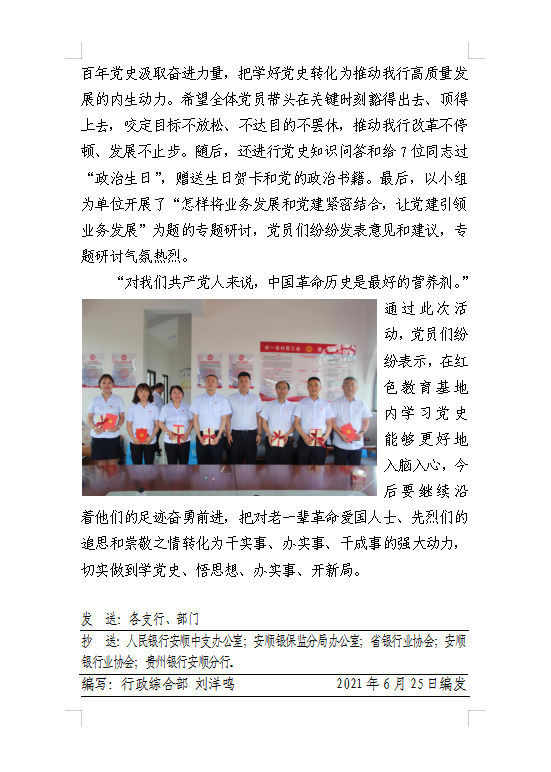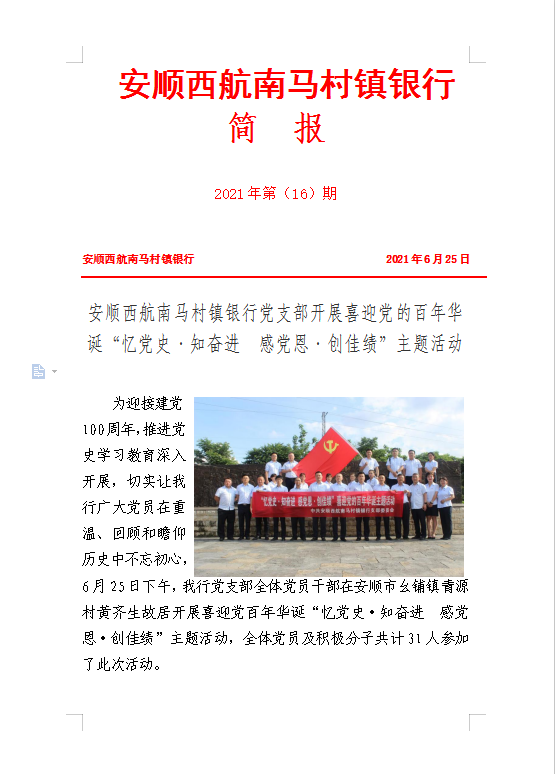 安顺西航南马村镇银行党支部开展喜迎党的百年华诞“忆党史、知奋进、感党恩、创佳绩”主题活动
