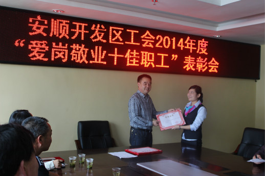热烈祝贺王冲同志,荣获2014年度安顺市开发区“爱岗敬业十佳员工”的荣誉称号,希望广大员工要以先进典型为榜样,学习他们投身基层、爱岗敬业的工作态度,学习他们任劳任怨、勤勤恳恳的高尚品质;学习他们求学务实的优良作风